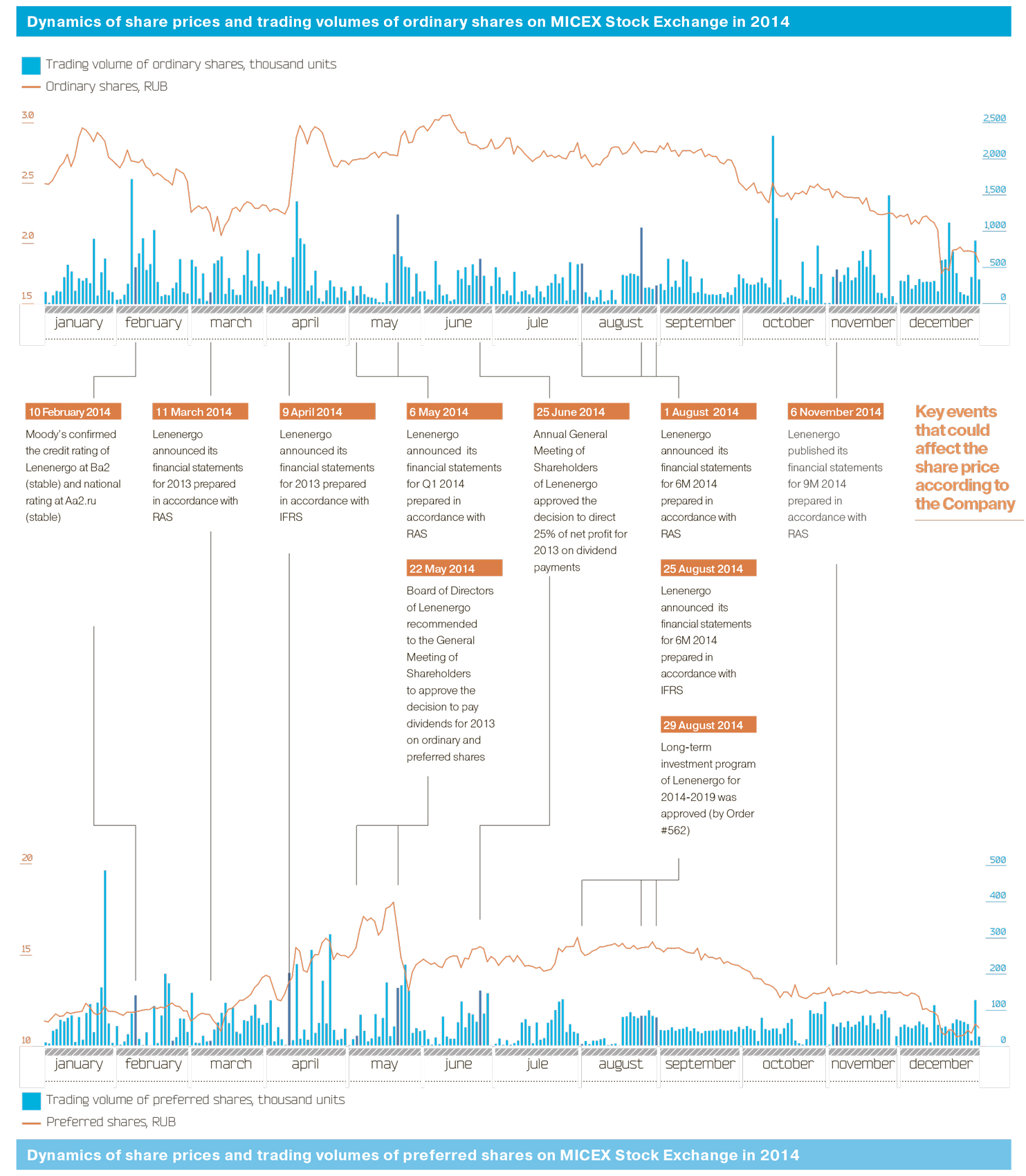 In 2014, Lenenergo shares were traded in the general downward trend with distribution grid companies and industry index, reflecting the mistrust of investors to the sector due to the ongoing uncertainty of state policy in respect of the distribution grid sector.