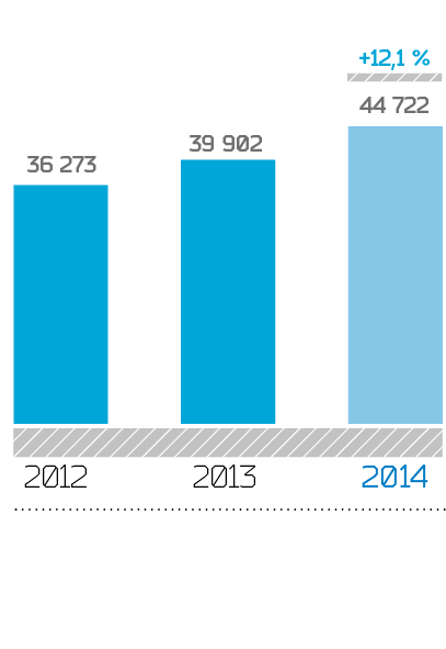 Выручка от реализации по итогам 2014 г. составила 44 722 млн руб., что на 4 820 млн руб. (12,1 %) выше, чем в 2013 г.