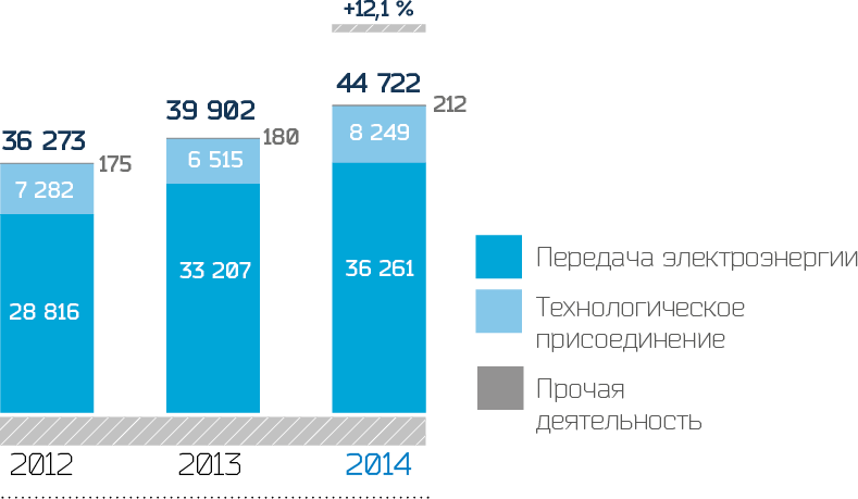 Выручка от реализации продукции (услуг) по итогам 2014 г. составила 44 722 млн руб., что на 4 820 млн руб. (12,1 %) выше, чем в 2013 г. Данный рост обусловлен увеличением всех составляющих, а именно: выручки от передачи электроэнергии, от оказания услуг по технологическому присоединению, по прочим услугам.