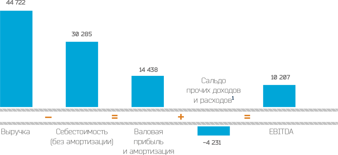 Вместе с тем прирост выручки (+12,1 %, или 4 820 млн руб.) составил большую величину по сравнению с ростом себестоимости за вычетом амортизации (+7,5 %, или 2 116 млн руб.). В результате показатель валовой прибыли до вычета амортизации (прибыль, получаемая как разница выручки и себестоимости за вычетом амортизации) возрос в меньшей степени по сравнению с приростом отрицательного сальдо прочих доходов и расходов без учета процентов к уплате и получению и достиг 2 704 млн руб., или 23,0 %.