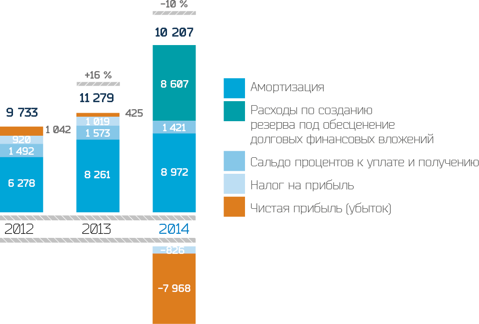По итогам 2014 г. показатель EBITDA, характеризующий генерируемый Компанией денежный поток до уплаты налогов и процентов, составил 10 207 млн руб., что ниже уровня 2013 г. на 1 072 млн руб., или на 9,5%. Снижение показателя произошло за счет увеличения отрицательного сальдо прочих доходов и расходов без учета процентов к уплате и получению и расходов по созданию резерва под обесценение финансовых вложений (на 3 776 млн руб.) — в основном за счет увеличения отрицательного сальдо по резервам по прочим условным обязательствам.