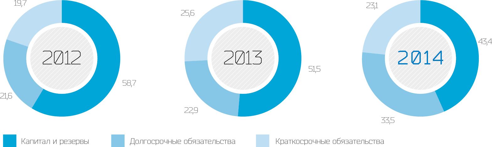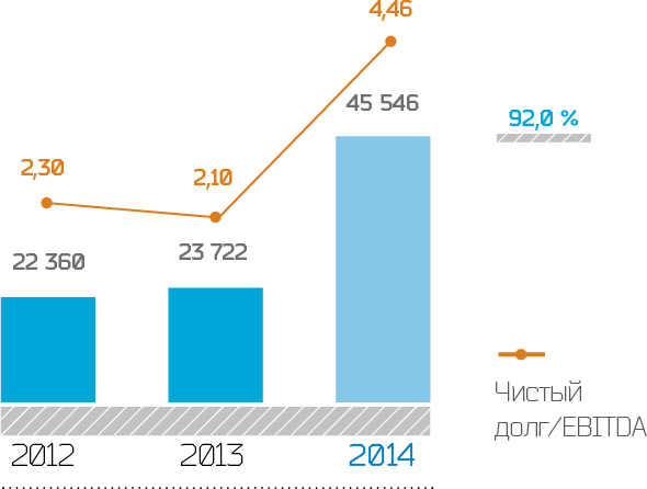 По сравнению с началом отчетного года соотношение чистый долг/EBITDA также возрастает, что обусловлено увеличением суммы чистого долга (за счет роста величины долга при одновременном снижении суммы наиболее ликвидных активов), в то время как величина EBITDA за 2014 г. уменьшается.