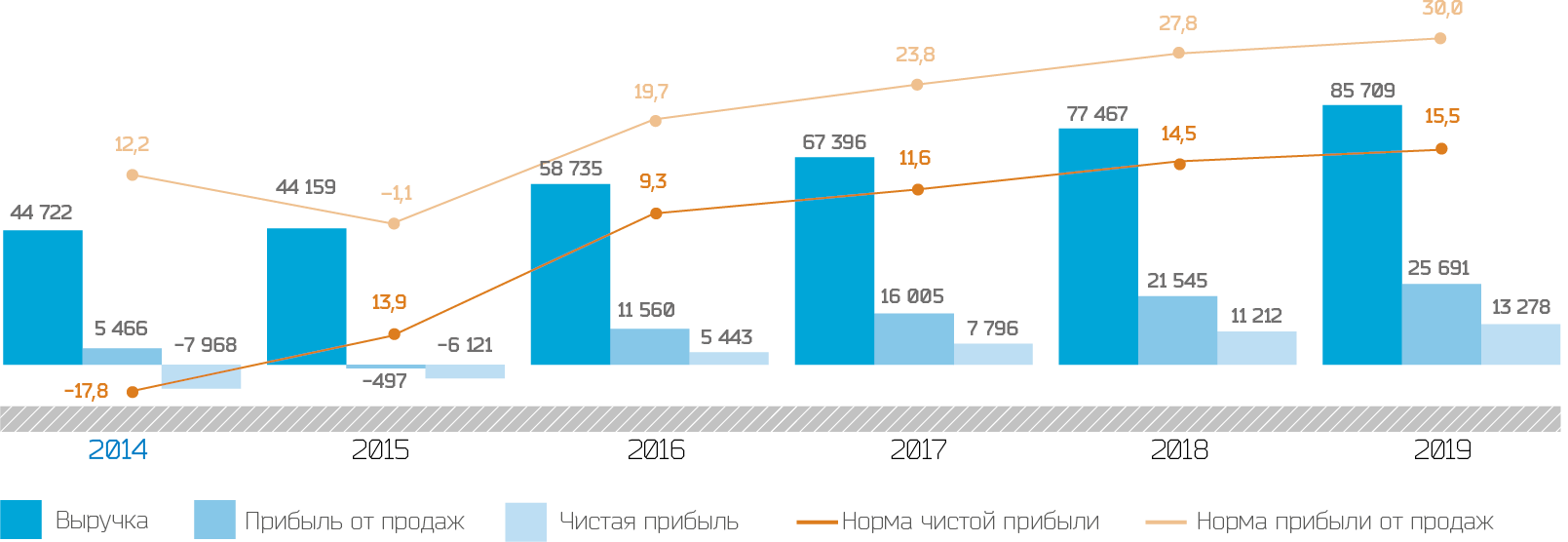 В предстоящие 5 лет прогнозируется постепенное увеличение показателя EBITDA — до 39 310 млн руб. к 2019 г., при параллельном росте рентабельности по EBITDA до 45,9% в 2019 г., что положительно характеризуется с позиции оценки финансового состояния и результатов деятельности Общества.